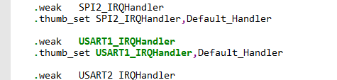 根据编译要求,这个接口既然已经引用了,那之前我们没有使用该中断,也就是没有定义个这接口的时候为什么没有发生编译报错呢?因为.s文件还有如下定义。weak关键字,简而言之,如果我们定义了就使用我们的定义,如果我们不定义就用默认定义。