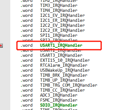 这里我们定义了一个中断回调函数USART1_IRQHandler,那为啥是这个函数名字呢?是否可以随便定义?当然可以随便定义,但是需要注意的是要和start文件(就是前面介绍的.s文件)中的中断向量表中的名字一致,我们看看对应的中断向量表中是什么名字呢?