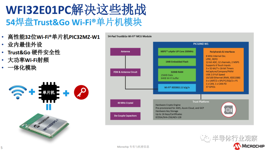 为了解决以上问题,Microchip特意推出了首款Trust&Go Wi-Fi® 32位单片机模块WFI32E01PC。从Alex的介绍我们得知,这款单片拥有一款叫做PIC32MZ-W1的高性能32位单片机,它有1兆的闪存和256KB的RAM,可以应付很多复杂的物联网应用。