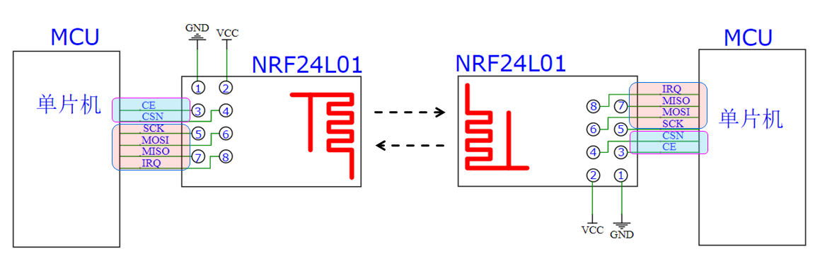 这是两颗单片机借助NRF24L01实现无线通信的接线原理图,他们的连接非常简单。这个模块会占用单片机的6个引脚,我们使用单片机的2个普通IO端口连接模块的片选和使能引脚,用单片机的SPI引脚或普通IO口模拟SPI总线连接模块的SPI引脚即可实现数据交换。如图4.