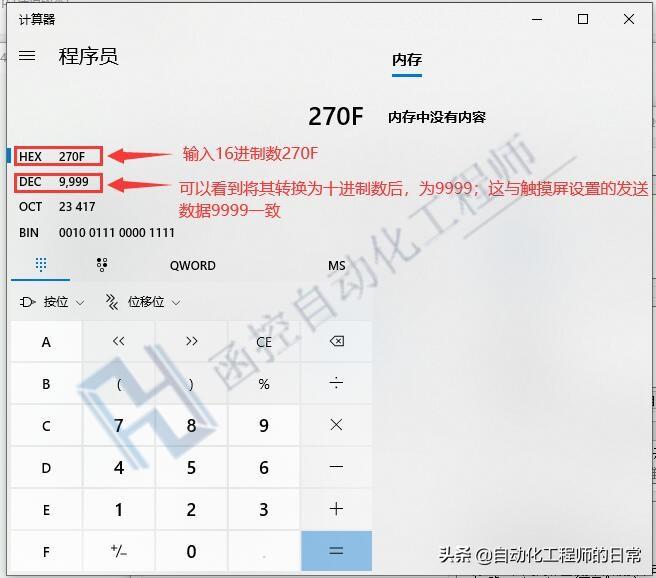 为了验证数据的正确性,打开电脑的计算器工具,将其设置为程序员模式。选择16进制输入模式。输入0F27,可以看到转换为十进制后数据为3879,这与触摸屏输入的数据9999无法对应。这是什么地方错了吗?其实不是。这只是数据的高低字节交换了,这在通信数据传输处理的时候需要特别注意。初次进行串口通信调试,很多都被这个给折腾过。
