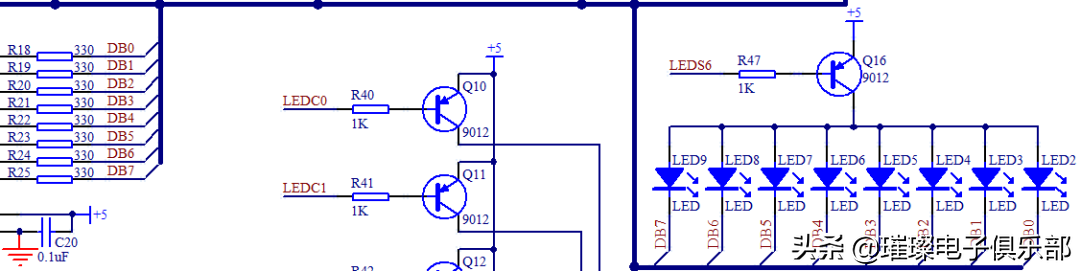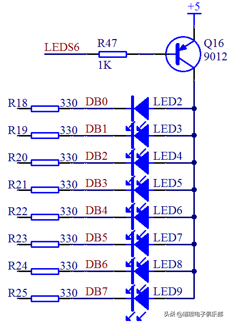 这里我们要学会看电路图的一个知识点,电路图右侧所有的 LED 下侧的线最终都连到一根黑色的粗线上去了,大家注意,这个地方不是实际的完全连到一起,而是一种总线的画法,画了这种线以后,表示这是个总线结构。而所有的名字一样的节点是一一对应的连接到一起,其他名字不一样的,是不连在一起的。比如左侧的 DB0 和右侧的最右边的 LED2 小灯下边的DB0 是连在一起的,而和 DB1 等其他线不是连在一起的。