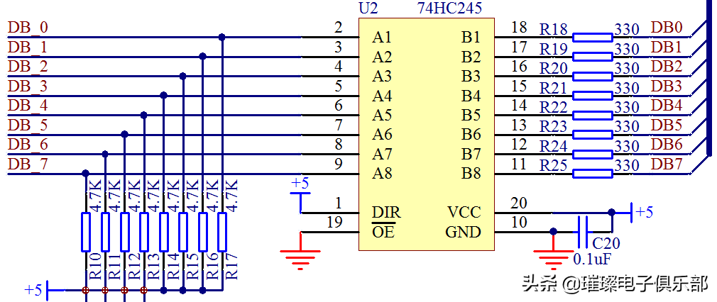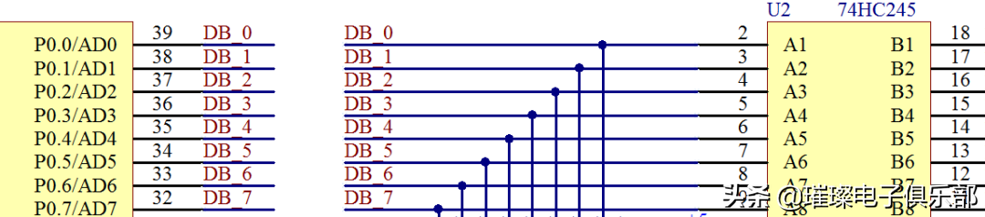 还有最后一个使能引脚 19 脚 OE,叫做输出使能,这个引脚上边有一横,表明是低电平有效,当接了低电平后,74HC245 就会按照刚才上边说的起到双向缓冲器的作用,如果 OE接了高电平,那么无论 DIR 怎么接,A 和 B 的引脚是没有关系的,也就是 74HC245 功能不能实现出来。