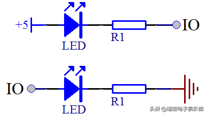 图 3-9 中上边的 LED 灯,和我们第二课讲过的 LED 灯是一样的,当 IO 口是高电平时,小灯熄灭,当 IO 口是低电平时,小灯点亮。那么下边的电路呢,按照这种推理,IO 口是高电平的时候,应该有电流流过并且点亮小灯,但实际上却并非这么简单。
