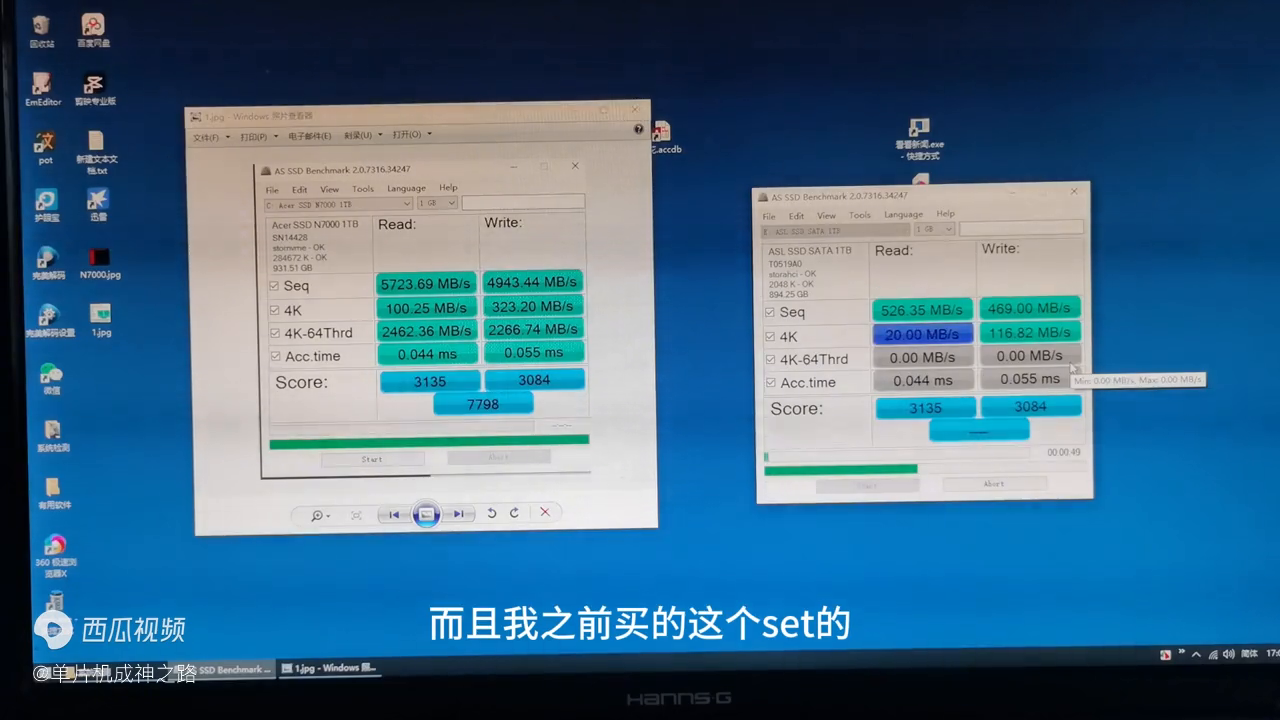 开始测试,达不到它飙升的7000多,但这样也是不错的,有7000多分很猛。这个是M2接口的PC24.0,对比一下我set接口的ET,之前买的将近差10倍。而且我之前买的set的空盘的时候速度还可以,到快满的时候大概用到70%,比机械硬盘还要慢得多得多得多。