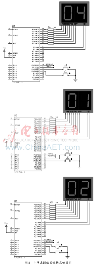 当多台51单片机工作于多机主从通信模式下,通信各方之间就有主、从之分;若直接采用TTL电平进行互连,则主机与各台从机之间的连接距离最好不要超过1 m[5]。主从式架构的网络具有如下一些特点。