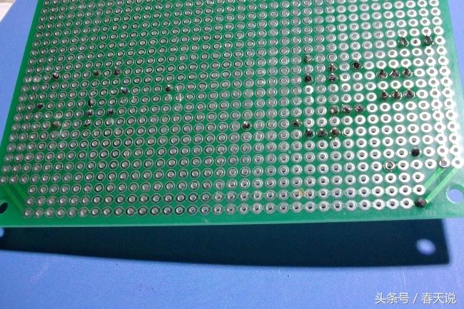 6、圆孔电源插座引脚太大,所以用小刀再万用板上转个洞,洞口不宜太大,刚好合适就行,然后用焊锡固定。