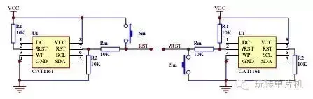 使用时注意的是 RST,/RST 引脚是 I/O 脚,CAT1161 检测到两引脚中任何一个电压异常都会产生复位信号,与 RST /RST引脚相连的下拉电阻 R2 和上拉电阻 R1 必须同时连接,否则CAT1161将不断产生复位!同样不需要手动复位功能时可节省Rm和Sm两个元件。