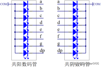数码管分为共阳 和共阴 两种,共阴数码管就是 8 只 LED 小灯的阴极是连接在一起 的,阴极是公共端,由阳极来控制单个小灯的亮灭;同理,共阳数码管就是 8 只 LED 小灯的阳极是连接在一起 的,阳极是公共端,由阴极来控制单个小灯的亮灭。