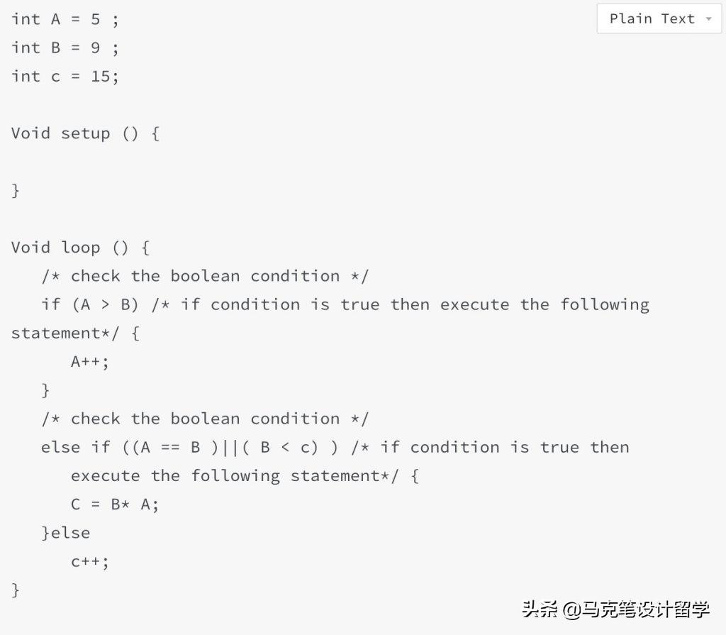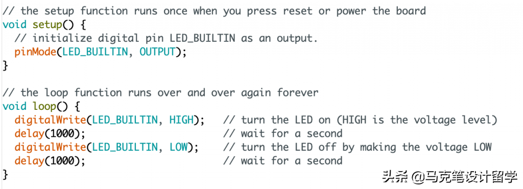 今天马克笔设计留学的程老师继续来跟大家讲解Arduino的相关知识。前面我们介绍了很多Arduino的传感器《Arduino人体红外传感器怎么用 》,那这篇文章我们来讲一下Arduino里面的编程语言,也就是一些常见函数的应用。Arduino 是由 C/C++ 混合编写而成。Arduino 语言也继承了 C/C++ 语言的语法。通常所说的 Arduino 语言,是指 Arduino 核心库文件提供的各种应用程序编程接口(Application Programming Interface,简称API)的集合。Arduino程序基本结构由setup() 和loop() 两个函数组成,那我们就先来看看这两个函数是如何使用的。