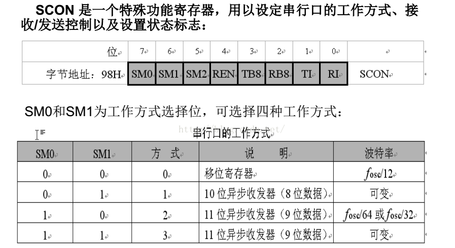 SM0(SCON.7)、SM1(SCON.6):控制串行口的工作方式。