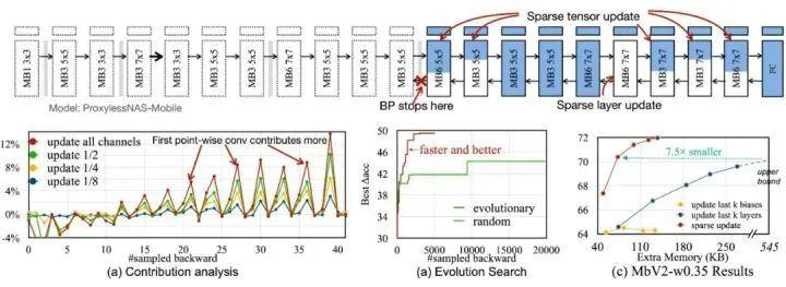 为了减少反向传播所需要的内存占用,我们提出了 Sparse Update,以跳过不太重要的层和子张的梯度计算。我们开发了一种基于贡献分析的自动方法来寻找最佳更新方案。对比以往的 bias-only, last-k layers update, 我们搜索到的 sparse update 方案拥有 4.5 倍到 7.5 倍的内存节省,在 8 个下游数据集上的平均精度甚至更高。