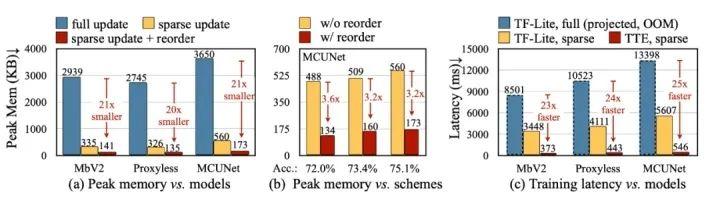 与 Full Update 相比,Sparse Update 有效地减少了 7-9 倍的峰值内存,并且可以通过 reorder 进一步提升至 20-21 倍的总内存节省。相比于 TF-Lite,TTE 里经过优化的内核和 sparse update 使整体训练速度提高了23-25倍。