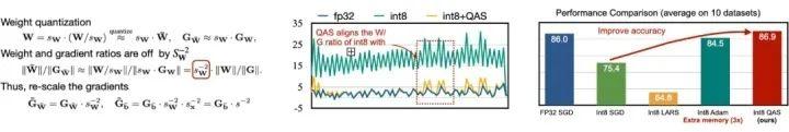 为了应对优化的困难,我们提出了 Quantization-Aware Scaling(QAS)来自动缩放不同位精度的张量的梯度(如下左图所示)。QAS 在不需要额外超参数的同时,可以自动匹配梯度和参数 scale 并稳定训练。在 8 个数据集上,QAS 均可以达到与浮点训练一致的性能(如下右图)。