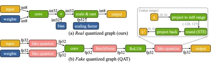 我们发现设备上训练有两个独特的挑战:(1)模型在边缘设备上是量化的。一个真正的量化图(如下图所示)由于低精度的张量和缺乏批量归一化层而难以优化;(2)小型硬件的有限硬件资源(内存和计算)不允许完全反向传播,其内存用量很容易超过微控制器的 SRAM 的限制(一个数量级以上),但如果只更新最后一层,最后的精度又难免差强人意。