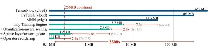 ▲ 传统框架训练需要的内存大大超过了智能终端设备的资源,我们所提出的协同设计,有效的将内存开销从几百 MB 降低至 256KB 以内。