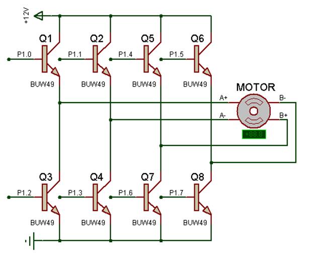 控制系统的电机驱动模块采用双极性驱动的方式。双极性驱动是指步进电机线圈中电流的流动方向不是单向的,即绕组中的电流有时沿某一方向流动,有时沿相反的方向流动。双极性驱动电路可以同时驱动四线式或六线式的两相混合式步进电机。