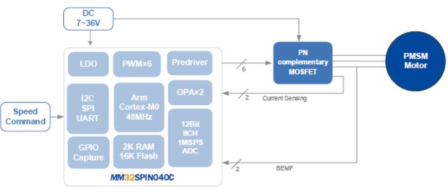随着科技进步和消费升级,消费者对电风扇的智能化需求日趋强烈。为了快速响应市场需求,以更低的成本打造智能电风扇。 MCU单片机智能控制落地扇解决方案以灵动微MM32SPIN040C主控。 方案采用的主控MM32SPIN040工作频率可达48MHz,内置16KB Flash,2KB SRAM高速存储器,针对电机应用内置2个运放,预驱工作电压高达36V。适合于三相永磁无刷电机,电动工具等多种应用场合。该方案适用于落地扇、塔扇、循环扇、吊扇等多种品类的风扇设备。我司英尚微可提供高速吹风筒、电扇等各种电机应用方案。 方案功能 支持顺逆风启动 无级变速调节 支持多种保护 应用框图