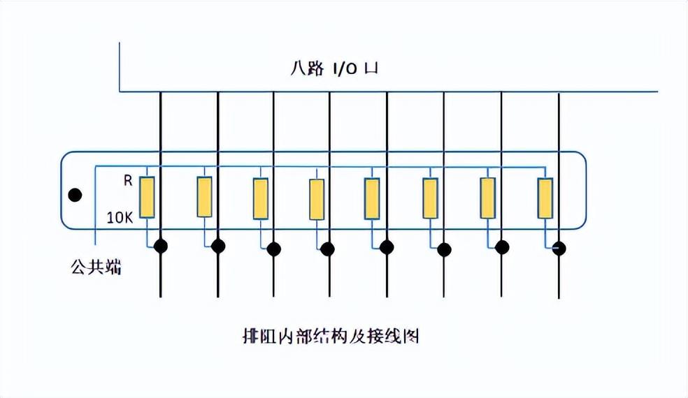 一般情况下,I/O口都会连接上拉电阻,目的有两个,一是使单片机运行稳定,二是提高单片机驱动能力;为了让单片机能承受更大的负载。上拉电阻用10K的9P排阻(其大小在1~10K都可,电阻小可提高驱动能力,电阻大可以降低功耗)。它有9个引脚,一个为公共端,另外八个引脚与I/O口相连。其结构及接线图如下图所示。注意,除了上拉电阻,还有下拉电阻,上拉电阻的公共端是接VCC,下拉电阻的公共端是接GND。