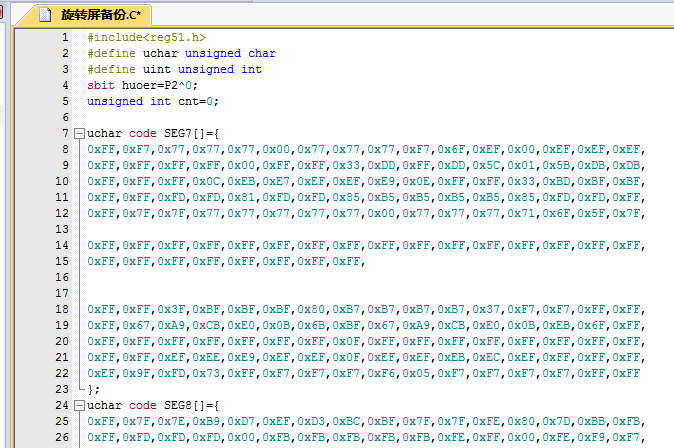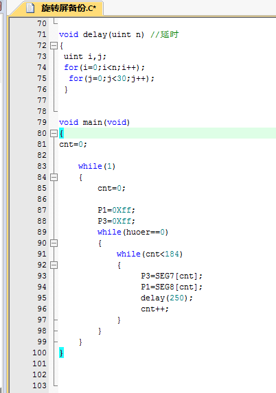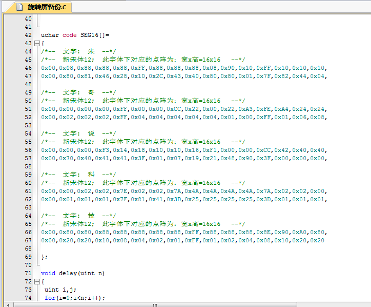 由霍尔测得速度来调整扫描速度,到达显示宽度不变的效果,霍尔也起到检测起点的作用,当检测到起点是发光二极管就开始扫描,这样就能在固定位置显示内容。下面的延时函数是用来控制扫描速度的,在电机转速不变的情况下,延时越大字体越宽,反之亦然。