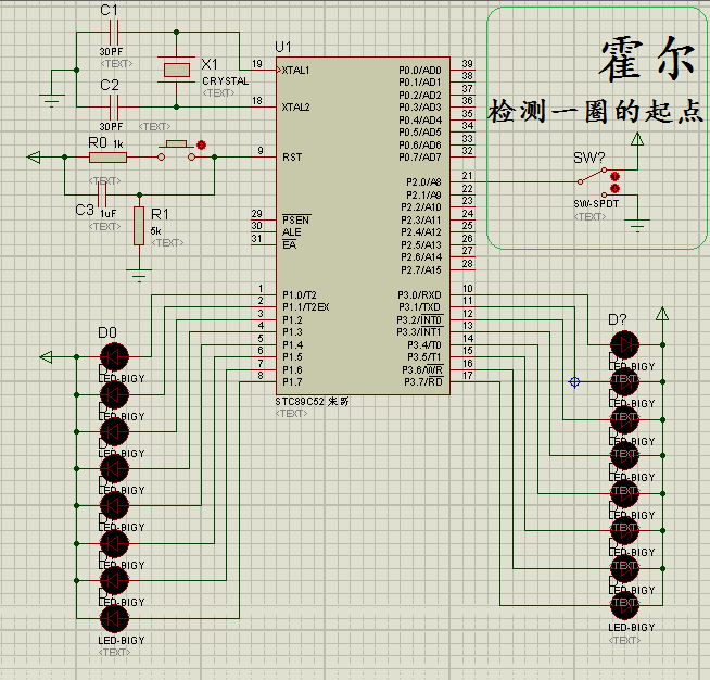 原理图为:单片机最小系统-供电电路、复位电路、振荡电路,16个发光二极管接到P1口和P3口,霍尔接到P2.0。单片机P1、P3为推挽输出,驱动发光二极管;P2.0为上拉输入,用来测速。