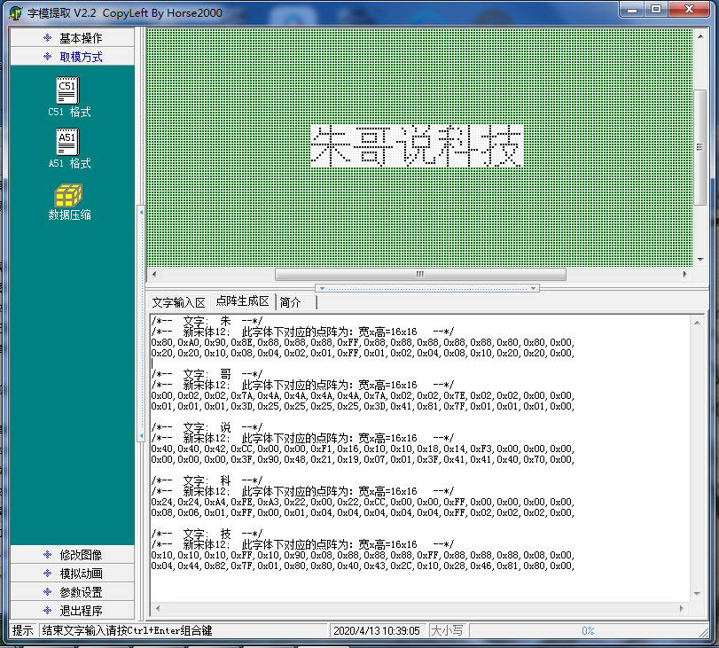 字体取模时要根据电路连接、发光二极管的布置选择取模方式:横向取模、纵向取模、字节倒序等一系列选项。