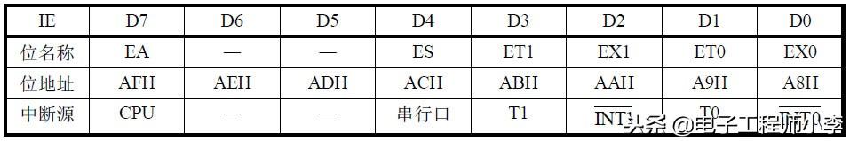 IE控制所有中断源的开放和屏蔽,字节地址为A8H,可进行位寻址,其具体的结构、位名称、位地址以及控制的相应中断源如表4-4所示。