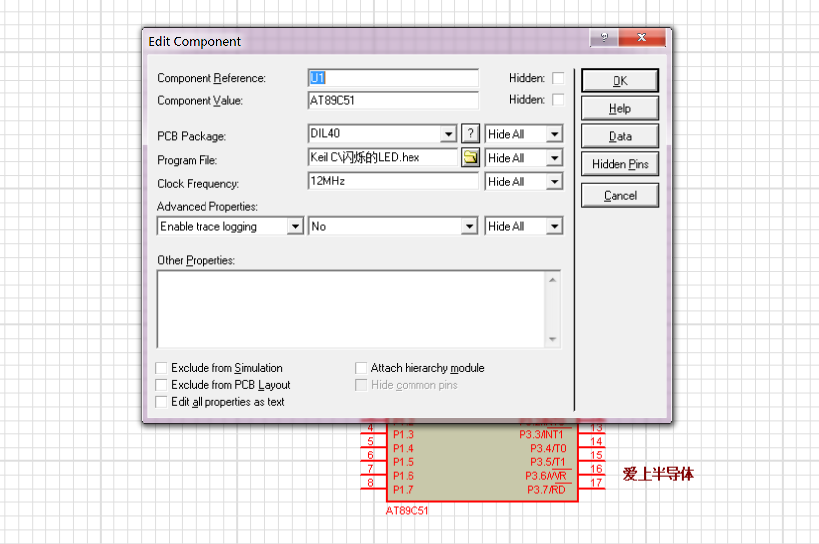 程序是用Keil编写的,完成之后需要生成hex格式的文件,然后打开Proteus,双击单片机,之后出现如下界面,然后点击Program File后面的文件夹,选择我们刚才生成的hex文件,至此大功告成。