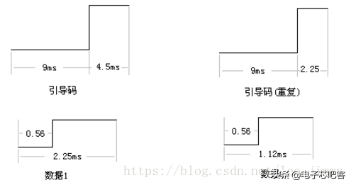 信息的开始是9ms高电平加4.5ms低电平的引导码,作用就是告诉设备通讯开始,有信号发送过来了。之后接的是8位地址码和8位地址反码,地址码的作用就是区分不同的接收器件,实现单独控制某个器件。最后是8位数据码和8位数据反码,数据码就是功能码,我们可以给不同数据码设定不同的功能,反码的作用就是检验接收到的数据是否正确。在上面的这条信息里,‘0’是用560us高电平加560us低电平表示的,‘1’是用560us高电平加1680us低电平表示。要注意的是上面的波形图是发射端的波形,我们红外接收端收到的信号的高低电平是与上图相反的,还要注意发射端在发射数据是是从最低位开始发射,所以我们接收到的信号也是从最低位开始的,另外当我们持续按住同一个按键时,发射端并不会重复发送地址码和数据码而是在发送完一次后每隔一段时间发送一次引导码(重复),间隔时间大约是108ms。下图为接收端引导码、引导码(重复)、‘0’、‘1’的波形: