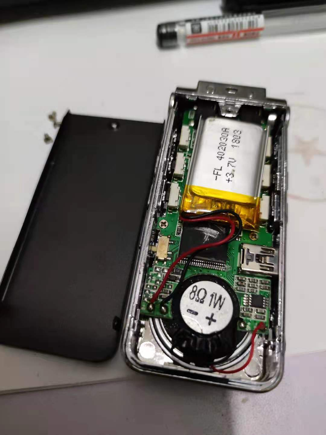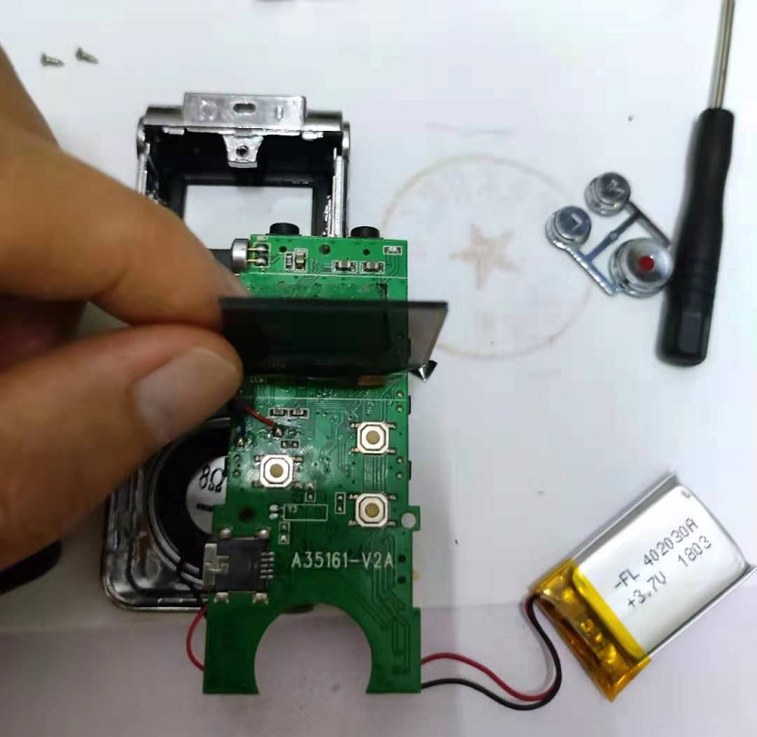 它上下两面是金属材质,中间是塑料,配色是黑配银白。拆开外壳,看到一个3.7V,402030规格的电池,容量没标,看大小的话估计就2,3百maH。剪下来留着用。用了LCD屏和FPC排线,排线直接焊接在PCB上,左边有个咪头,估计是用做背景降噪的,