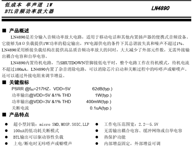 再看背面,顶部两个音频口,一个接麦克风,一个接耳机,中间夹着一个圆柱体晶振,左右两侧是一排的按键,电源开关和USB口,喇叭是8欧1W。功放与喇叭匹配,一般遵循两个原则:1. 功放的阻抗与喇叭(扬声器)阻抗一致,不能相差太远。2. 功放的功率一 般为扬声器功率的1.5〜2倍。看到它用的功放型号是LN4890,负载和功率都是匹配的,选型正确。