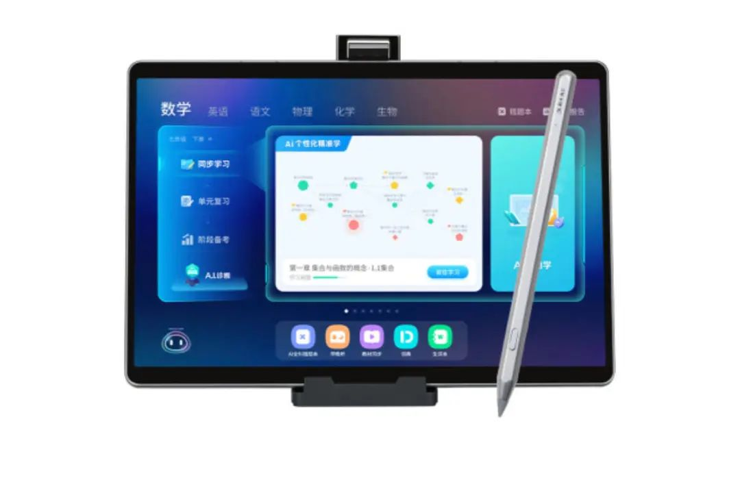 在平板顶部设有两个1600万线束的镜头,支持一体式升降旋转、自动对焦,用于拍试卷、拍课本、拍作业给设备处理,实现智能作业批改以及教学。