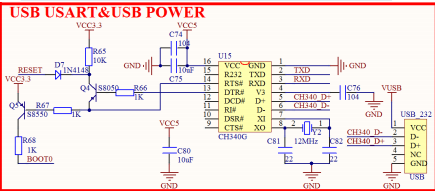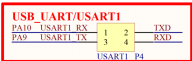 图中 TXD/RXD 是相对 CH340G 来说的,也就是 USB 串口的发送和接受脚。而 USART1_RX