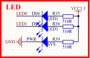 图中,PWR 是电源指示灯(蓝色),用于指示核心板的供电状态;DS0 是功能指示灯(红