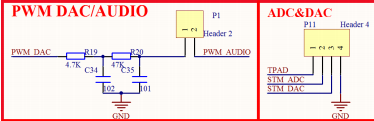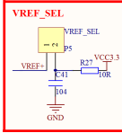 图中VREF_SEL默认用跳线帽连接1&2脚,从而VREF+=3.3V,即STM32芯片的ADC/DAC