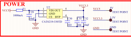 是自恢复保险丝,可以起到过流保护的作用。右侧的 5V、3.3V 和 GND 等三个 TEST_POINT