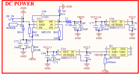 图中,U2 是稳压芯片,将 5V 转换为 3.3V,整个核心板的 3.3V 电源,都来自此芯片。F1
