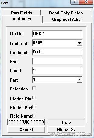 2、双击需要修改封装的其中一个元件,弹出元件的Part对话框。这里我们就以一个电阻位例。如图2,元件的类属性为RES2,我们知道这是个电阻,封装属性是0805,是贴片常用封装。
