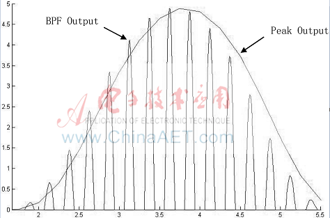 在超声波测距系统中,由于超声波的衰减以及超声波换能器压电陶瓷在压电转换过程中的惯性滞后导致超声波的回波信号被拓宽,使得回波到达时间点不确定,同时由于传统设计的比较器阈值固定,增大了误差的发生几率,所以包络峰值检测在判断飞越时间的过程中起着重要作用。通过MATLAB提供的库函数可以方便地提取包络,但是MATLAB库函数用C语言很难实现,而且过于频繁的乘加运算和FFT运算会增大工程算法的延时,对超声波测距带来不利影响,且不便于移植。