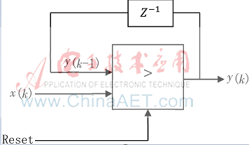 峰值提取新算法是利用C语言实现峰值检测,其理论依据为移位算法。如果峰值提取器的输入大于先前的峰值提取器的输出,则峰值提取器的输出被更新,其理论框图如图4所示。