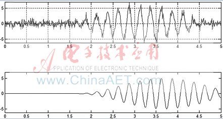 基于MATLAB的IIR数字滤波器的设计有多种方式,经过反复实验,在最大程度节约开发成本、保证滤波效果的情况下,确定滤波器的阶数设定为2,采用模拟滤波器通过双线性变换法转数字滤波器。为了方便ARM内核的移植,同时考虑到倒车雷达用户不需要使用C来设计滤波器,结合实际工程需要,利用MATLAB软件开发与设计滤波器,得到滤波器的传递函数参数,然后再将MATLAB中的filter函数利用C设计实现,即可以达到事半功倍的效果。图3所示为超声波回波信号与带通滤波器的输出,可以看出对于高斯噪声的抑制效果优良。
