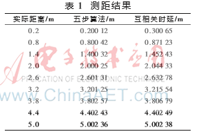 通过超声波测距系统的量程(20 cm~5 m)固定距离,并以60 cm步进,分别使用本文设计的数字通路五步算法和传统经典的互相关时延算法进行了测距性能的对比,测试结果如表1所示。可以看出,在同等测试环境下,由于码元长度的限制以及包络提取、信道噪声的影响,互相关算法在近距离时出现了较大的误差,相比之下本文算法的精确度更高。