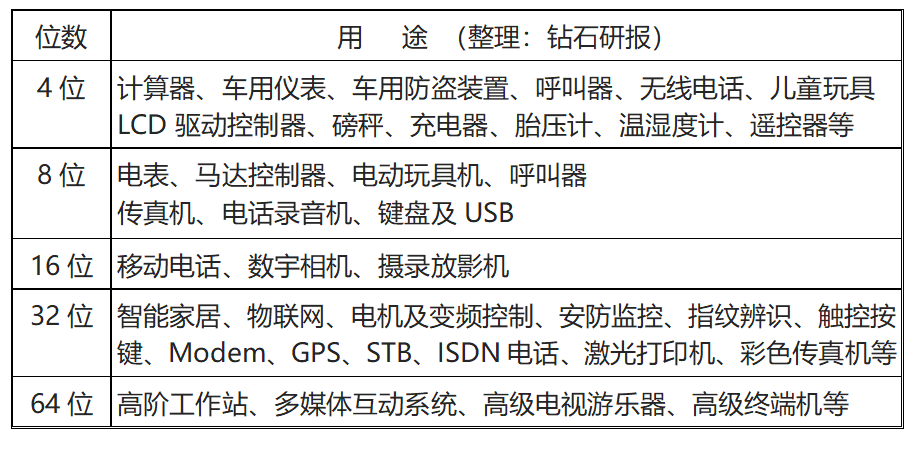按照位数来划分,MCU可分为4位、8位、16位、32位和64位微处理器,现在32位MCU已经成为主流,正在逐渐替代过去由8/16位MCU主导的应用和市场。若按照指令集架构(ISA)来划分,MCU类型包括8051、Arm、MIPS、RISC-V、POWER等微处理器。基于Arm Cortex-M系列内核IP的MCU已经成为32位MCU的市场主流,最近几年开源的RISC-V微处理器也开始流行起来,特别是在新兴的物联网领域。