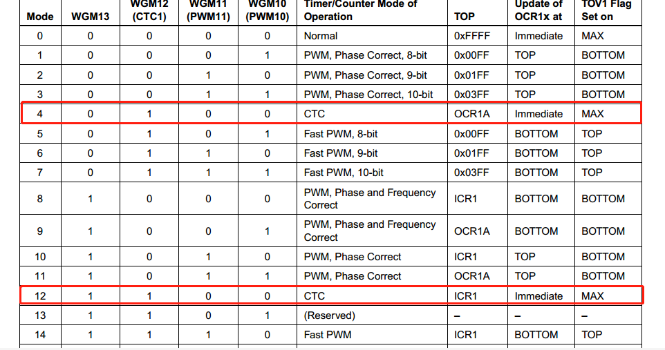 其中Mode4和Mode12为CTC模式,注意一下几点: