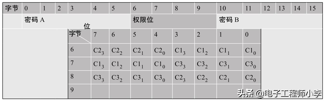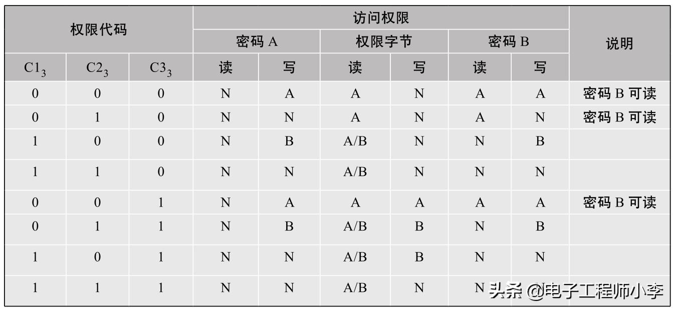 C13C23C33=001,根据表15.3,密码A不可读,但通过密码A校验后,可改写密码A,权限字节及密码B的读写权限均可用密码A读写。