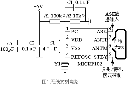 使用中应注意的问题是:(1)REFOSC(引脚4)是基准振荡端,连接晶振到地,或采用AC耦合方式输入峰-峰值为0.5 V的时钟脉冲。发射频率是基准振荡器频率的32倍:基准振荡频率×32=发射频率。如果使用外接时钟信号,须采用AC耦合方式,输入信号幅度峰-峰值为200~500 mV。(2)MICRF102使用差分输出去驱动天线负载。功率放大器输出级包含有一个变容二极管,它自动与天线的电感调谐,以保证谐振在发射频率上。典型的PCB导线天线的电感与回路的尺寸、天线导线的宽度、PCB铜泊的厚度和接地板的位置有关。设计时一般选择变容二极管的电容值为6.5 pF。天线电感L由公式L=1/(4π2f2C)计算。(3)功率放大器的输出功率与PC端(引脚1)上的电压有关。正常工作时,该引脚端上的电压被设置在0.2~0.4 V之间。PC端上的电压上升,输出功率加大;但是,如果PC端上的电压超过0.4 V,功率放大器被限流,输出功率不再增加。减少PC端的电压可降低电源功率消耗,同时也会减少RF输出功率。(4)STBY端(引脚5)是待机模式控制。接VDD为发射方式,接VSS为待机模式。(5)MICRF102芯片对电源纹波敏感,正确地电源旁路是必需的,一般使用4.7μF、 0.1μF、100 pF 3个电容并联在VDD和VSS之间。