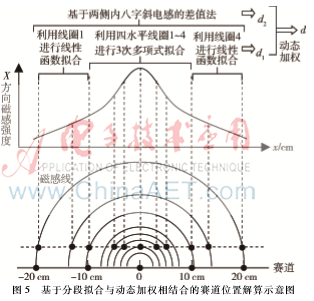 如图5所示,基于分段拟合与动态加权的赛道位置解算方法的基本思想为:首先采集6个线圈的感应电动势(E1~E6)并对其进行比较,当E2或E3最大时,表明小车与赛道的偏离距离d∈[-10 cm,10 cm]区间,此时将采用四水平线圈检测的感应电动势E1~E4进行三次多项式拟合,并通过求极值的方法来解算赛道偏移位置d1;而当E1最大时,表明小车与赛道的偏离距离d∈[-20 cm,-10 cm)区间,此时将利用感应电动势E1,通过离线拟合的线性函数来解算赛道偏移位置d1;同理,当E4最大时,表明小车与赛道的偏离距离d∈(10 cm,20 cm]区间,此时也将利用感应电动势E4,通过离线拟合的线性函数来解算赛道偏移位置d1;与此同时,还要根据两侧内八字斜电感的感应电动势E5和E6,利用差值法来解算赛道偏移位置,并将其记为d2;最后将d1与d2加权求和,即可得到最终的赛道偏移位置为: