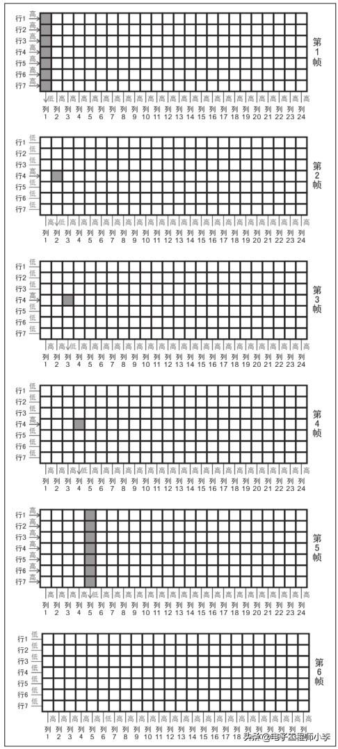 如图28.4所示,箭头代表电流的流向,灰色的方块代表亮起的点。总共6帧图,即显示“H”字符的整个过程图解。“H”字符共5列数据,加上字符后的空格共6列数据,我们就把它分成6个步骤来显示,从左至右一列一列地显示,每次只亮起一列数据,每幅图表示每一次显示的状态。请注意,它每次只显示一列数据。前面已经讲过,我们人眼的视觉暂留效应时间一般是1/24s或者更久,如果是只显示这个“H”字符,那只要保证6列数据都显示完一次的总时间在1/24s内,我们就会感觉这6次显示的画面是一次显示出来的画面。但这个时钟的屏是24列显示的,同样的道理,只要保证在1/24s内显示完这24列数据就可以让我们感觉是一次显示出了整个画面,我们把显示完一次这24列数据叫做“刷新一次”。换个说法,就是一秒钟内能将整屏数据刷新24遍以上。就像电视的显示一样,1s钟刷新24遍以上,我们才不会感觉画面有闪烁。是不是有点头昏脑胀呢?不用急,闭上眼睛仔细体会一下整个扫描过程,但千万不要睡着,我们还要接着往下思考呢。