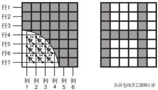 首先,我们来了解一下点阵屏的内部结构,本文所用到的6×7的点阵模块结构如图28.3所示,就是由一个个的发光二极管组合而成,将这些发光二极管按行列的方式焊接在一起,大家注意仔细看它的焊接方式,焊接完后,最后再封装成一个模块。了解了内部的结构后,如果你很感兴趣又不怕麻烦,我们也可以用LED自己动手制作显示模块,这样灵活性更大。现在我们要让这个显示模块显示如图28.3所示的“H”字符,由于模块内部已经将发光二极管按行列方式焊接在一起,我们要一下子显示“H”字符是不行的。那用什么方法才能让它显示呢?也许聪明的你会立马想到,那我们能不能分步骤来显示出来呢?答案是肯定的。如果你还能根据前面我所讲的一堆文字想到分步骤显示的方法,那你为什么不跳过这段直接去读下段呢?不要紧张,其实分步骤显示原理很简单,即刚才讲的扫描显示,利用人眼的视觉暂留效应,在比较短的时间内每次显示一部分内容,最后由于眼睛的迟钝反应,感觉这些内容就是一次显示出来的。还有疑问?带着疑问继续看图吧。
