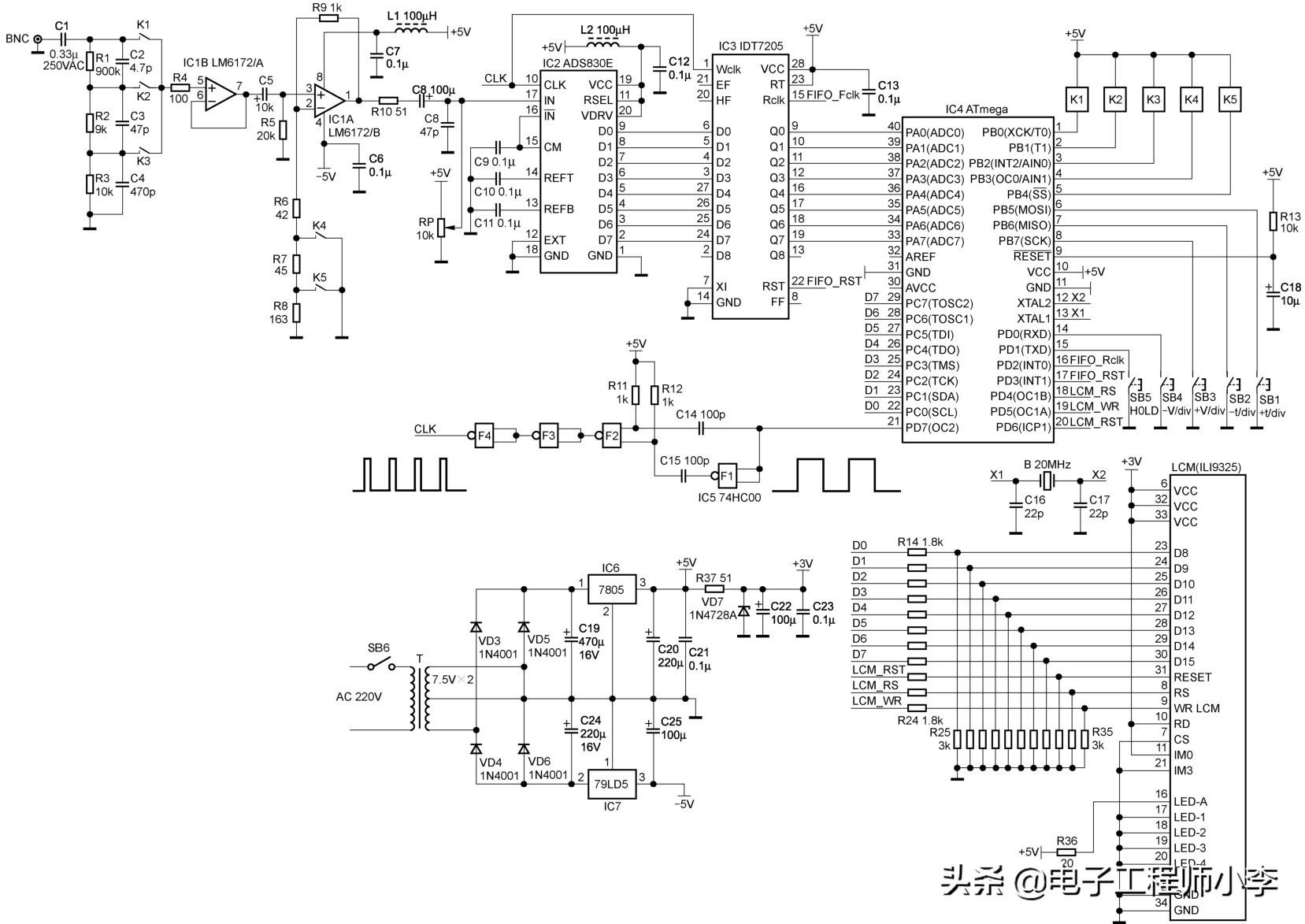 这个数字示波器使用了交流电源,提供+5V、−5V、+3V三种直流电压。